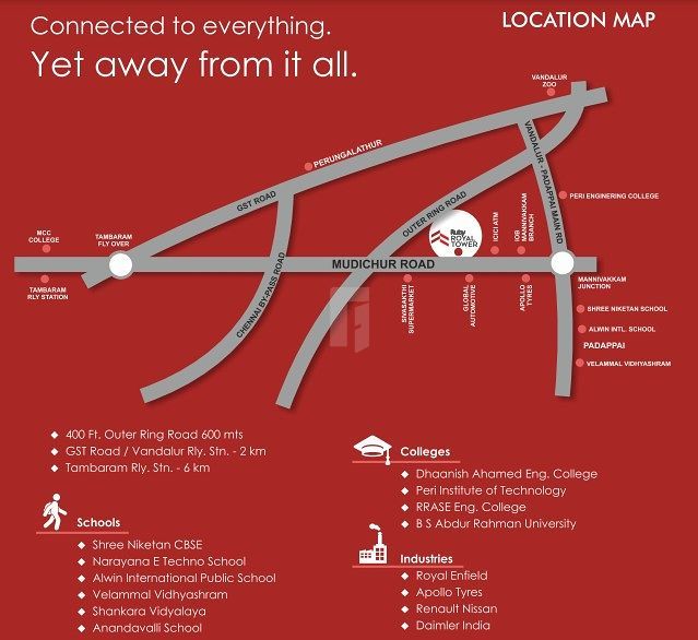 Set against a vibrant surrounding, Ruby Royal Tower comprises of premium apartments that fit right into your budget. Located bang on Mudichur Road, it enjoys supreme connectivity to GST Road, Tambaram, and the proposed CMBT Phase II. It is strategically situated so that your access to supermarkets, transportation, and other entertainment options are in walkable distance. Here, space and light are the key, therefore very room is carefully designed to offer utmost space, with natural light and breeze filling the homes during the day. Enhancing your home further is a range of modern amenities that make this a winning home to invest in.