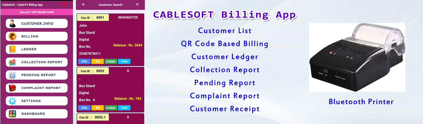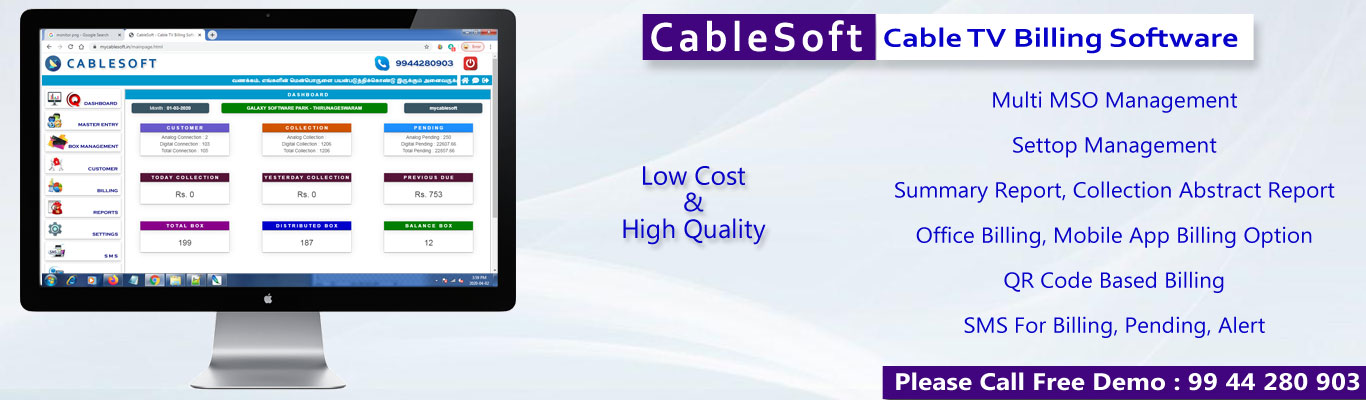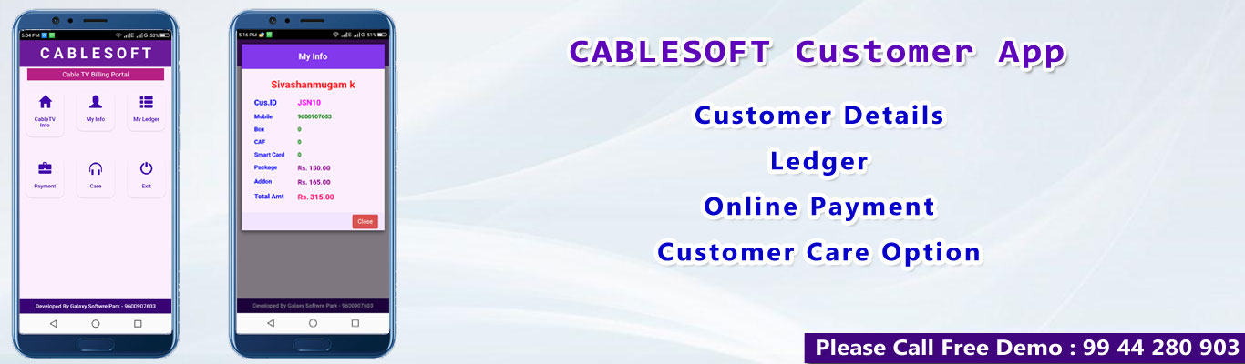Galaxy Software Park provide CableTV Billing Software. CableSoft include web application and android app. It helps to cabletv operator to maintain the business easy way. It support multiple MSO.
