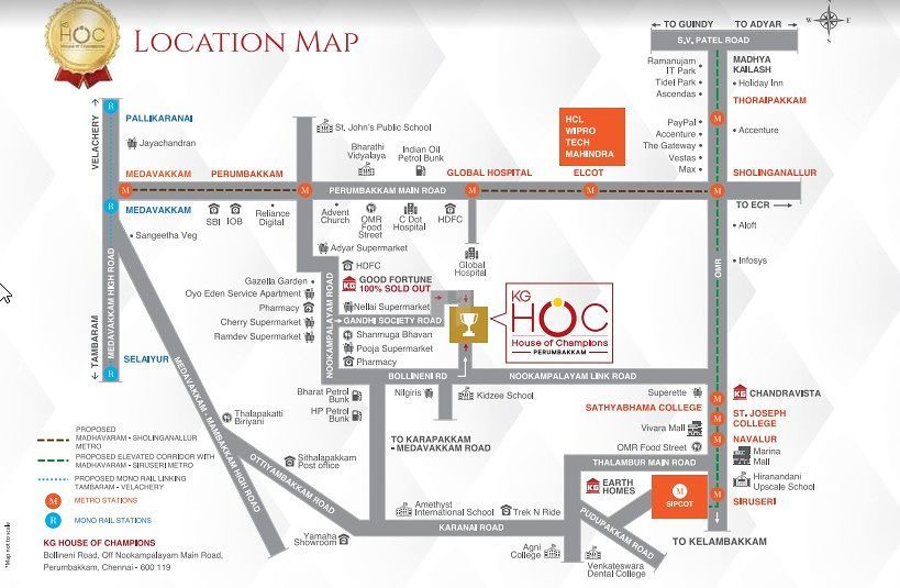 Seated in the heartland of all social and infrastructural development in Perumbakkam, KG House of Champions has all the makings of a rapidly appreciating asset. A Highly desirable apartment complex of 2BHK+2T homes in a stilt+ 5 floor structured loaded with 100+lifestyle Amenities, KG House of Champions is a spectacular reward for go-getters! Your HOC home is thoughtfully designed to be Vaastu-compliant; allow maximum natural light and ventilation, flow of positive energy and provide ample spaciousness. From your HOC home, enjoy close proximity to Sholinganallur, the epicentre of IT operations, the bustling suburb of Medavakkam and the recreational hubs of ECR and OMR.